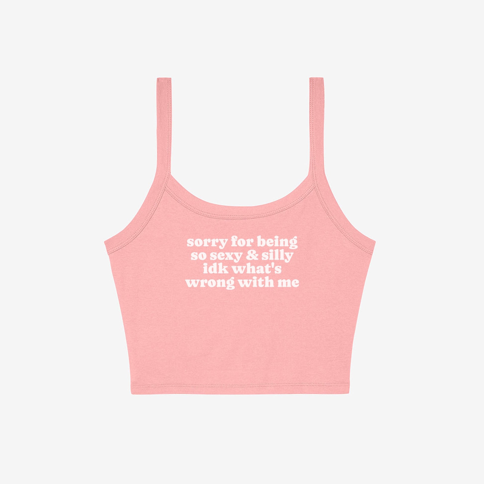 - Baby pink cami tank with "sorry for being so sexy & silly idk what's wrong with me" in white screenprint