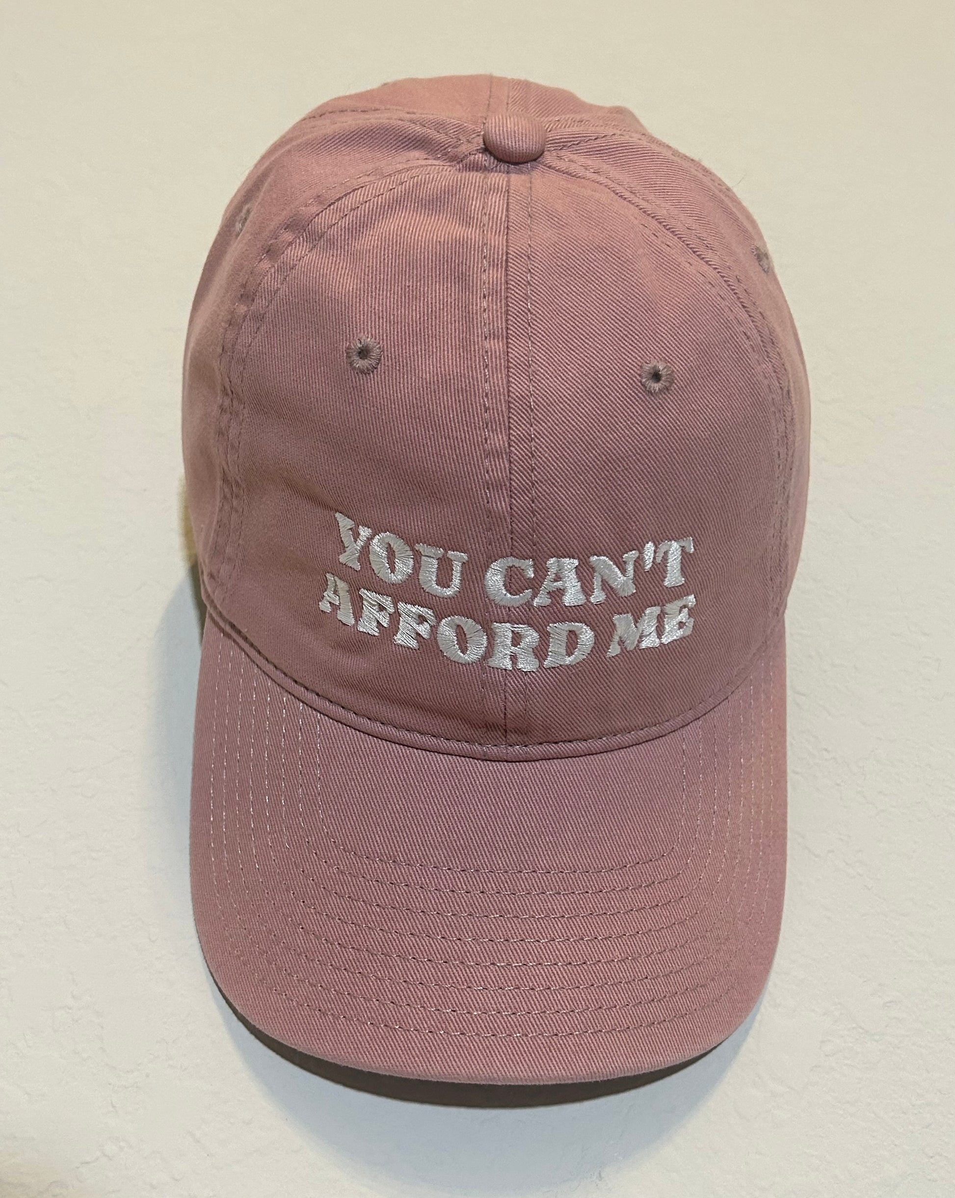 Blush pink hat with YOU CAN'T AFFORD ME in white embroidery